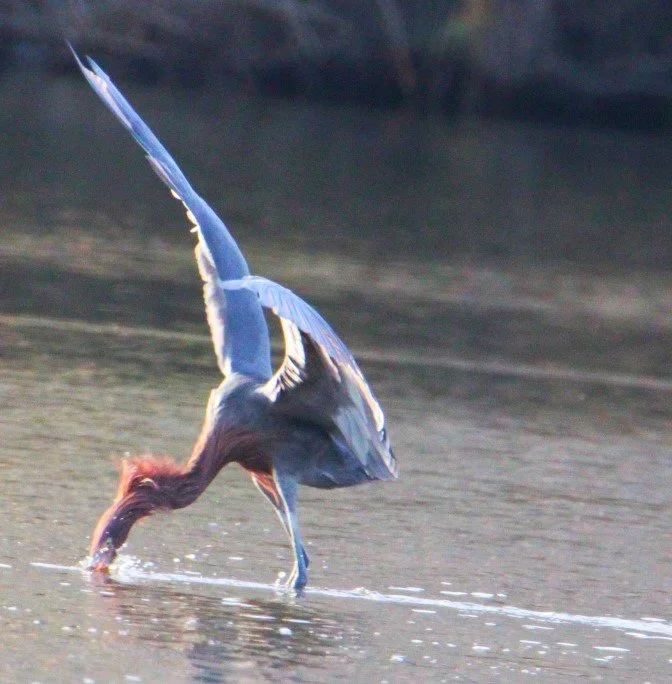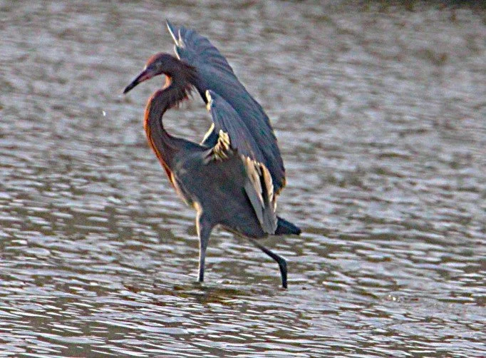 If you see one of these remarkable birds, watch for a few minutes and you will likely observe its distinctive foraging behavior, unique among North American egrets and herons. This is the most striking characteristic of Reddish Egrets we see at the estuary, and a tell-tale sign that it’s a Reddish Egret.